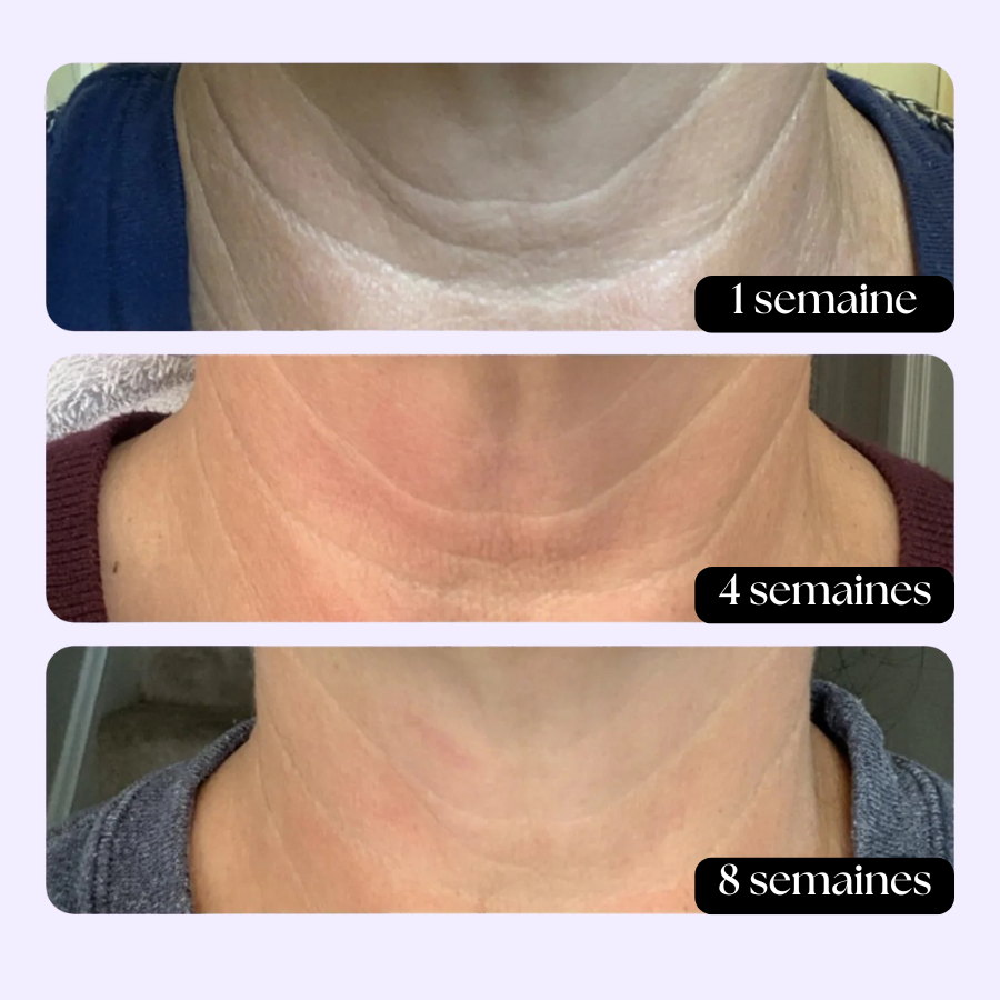 Notre complexe raffermissant exclusif transforme la peau délicate du cou en seulement 4 à 8 semaines pour une apparence nettement plus lisse, plus ferme et plus rebondie.